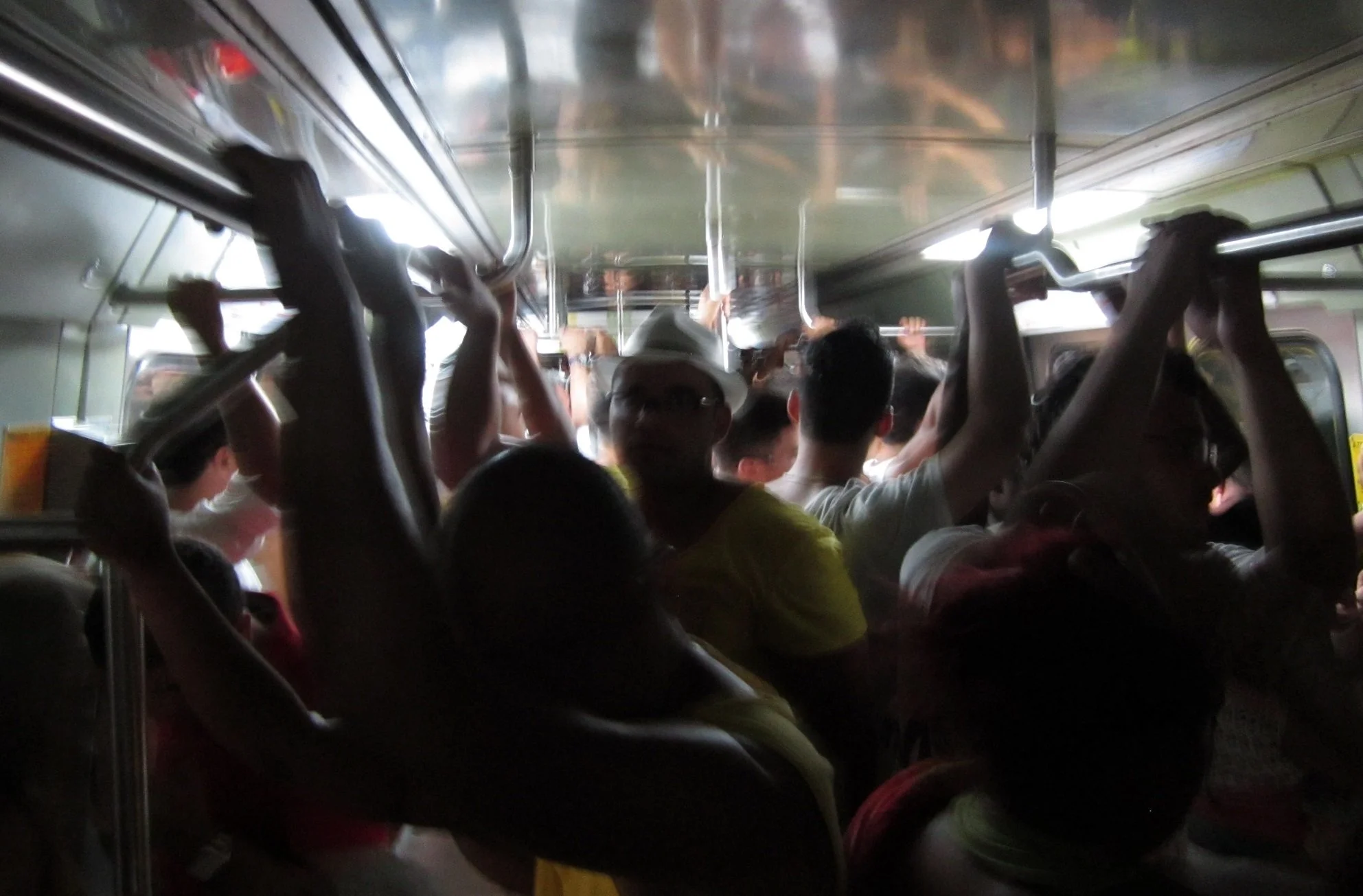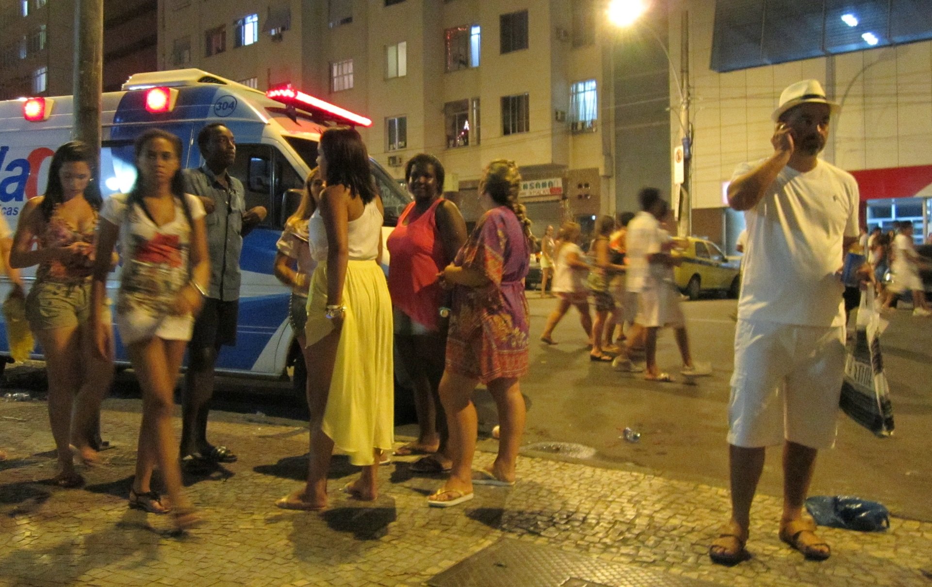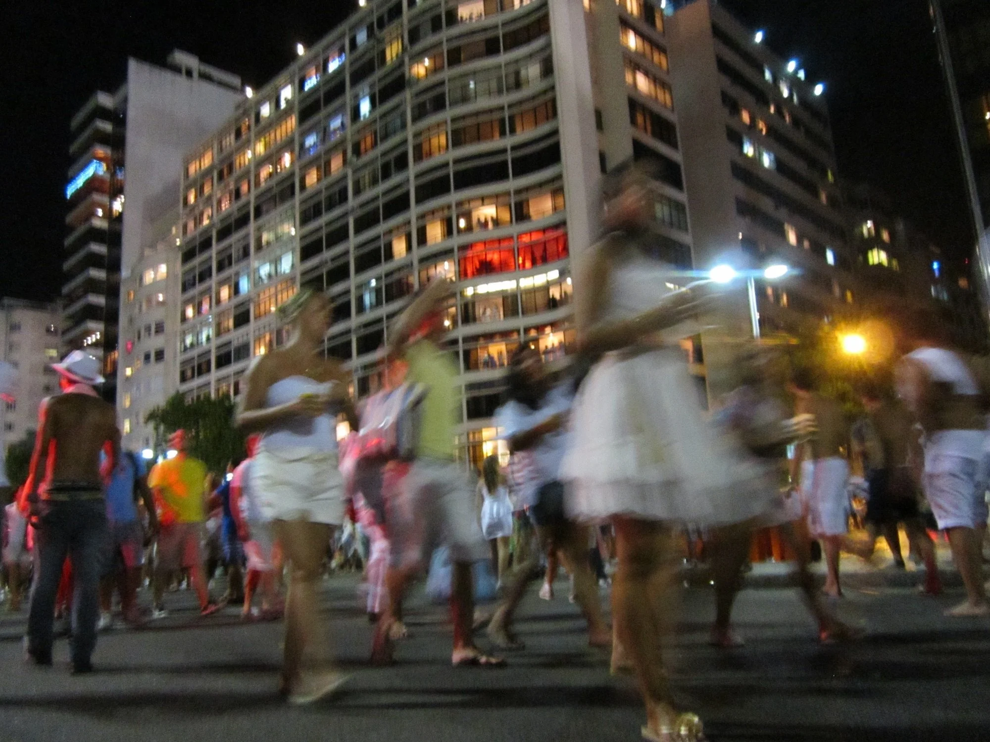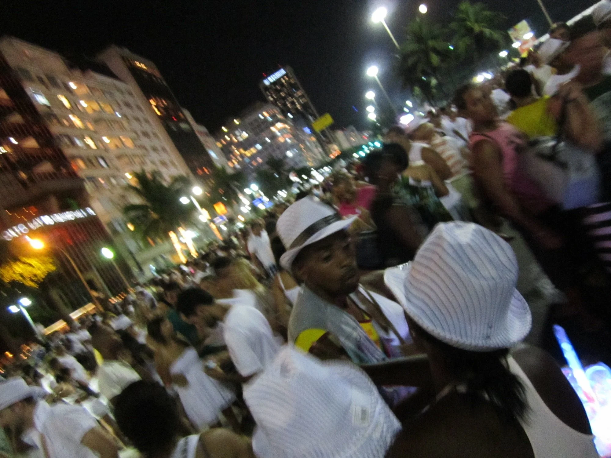 Am Silvesterabend dann funktioniert alles problemlos. Kein Stau am Eingang, entspannte Fahrt in der U-Bahn. Die meisten Leute haben weiße Sachen an. Ist ein lokaler Brauch, dem man aber nicht unbedingt mitmachen muß. Manche halten sich an einer Dose Bier fest. Das Getränk ist in Rio (und Brasilien) allenfalls eiskalt genießbar.
