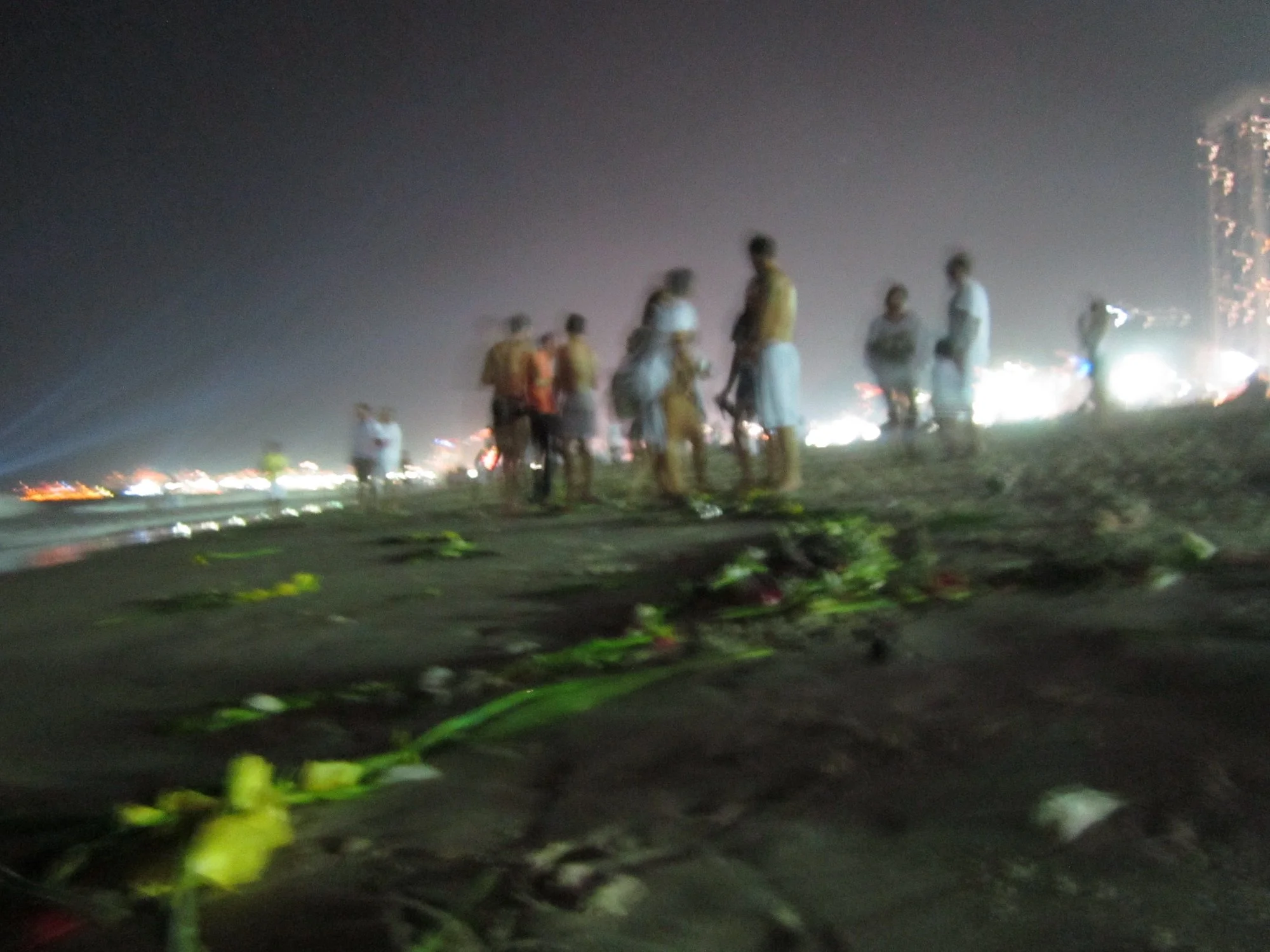 Aus der U-bahn 'geworfen', gehts in Richtung Copacabana. Kann man nicht verfehlen, weil Tausende den gleichen Weg haben. Am Rande der Straße stehen Blumenverkäufer, die ihr Geschäft machen wollen. Ein weiterer Brauch hier ist es, frische Blumen nach Mitternacht ins Meer zu werfen. Dazu 'muß' man siebenmal über eine Welle zu springen. Am Besten mit dem rechten Bein. Keine Ahnung, wer sich diesen Unsinn ausgedacht hat. Soll jedenfalls Glück bringen.
