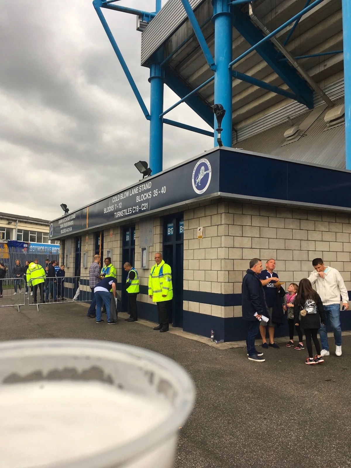 Vor dem Stadion dann noch ein Bier. Obwohl es ein durchaus brisantes Spiel ist, die Hools von Millwall diesen Ruf haben, wird unbeirrt Alkohol ausgeschenkt. Dann heisst es einen Platz suchen, bei dem man nicht nass wird. Denn überdacht ist hier längst nicht alles. Nummerierte Sitze gibt es nicht. Ich suche mir ein Plätzen mit Nachbarn, die gar finster blicken. Da könnte noch was gehen .... Zehn Minuten nach dem Anstoß werde ich auch schon gestört.