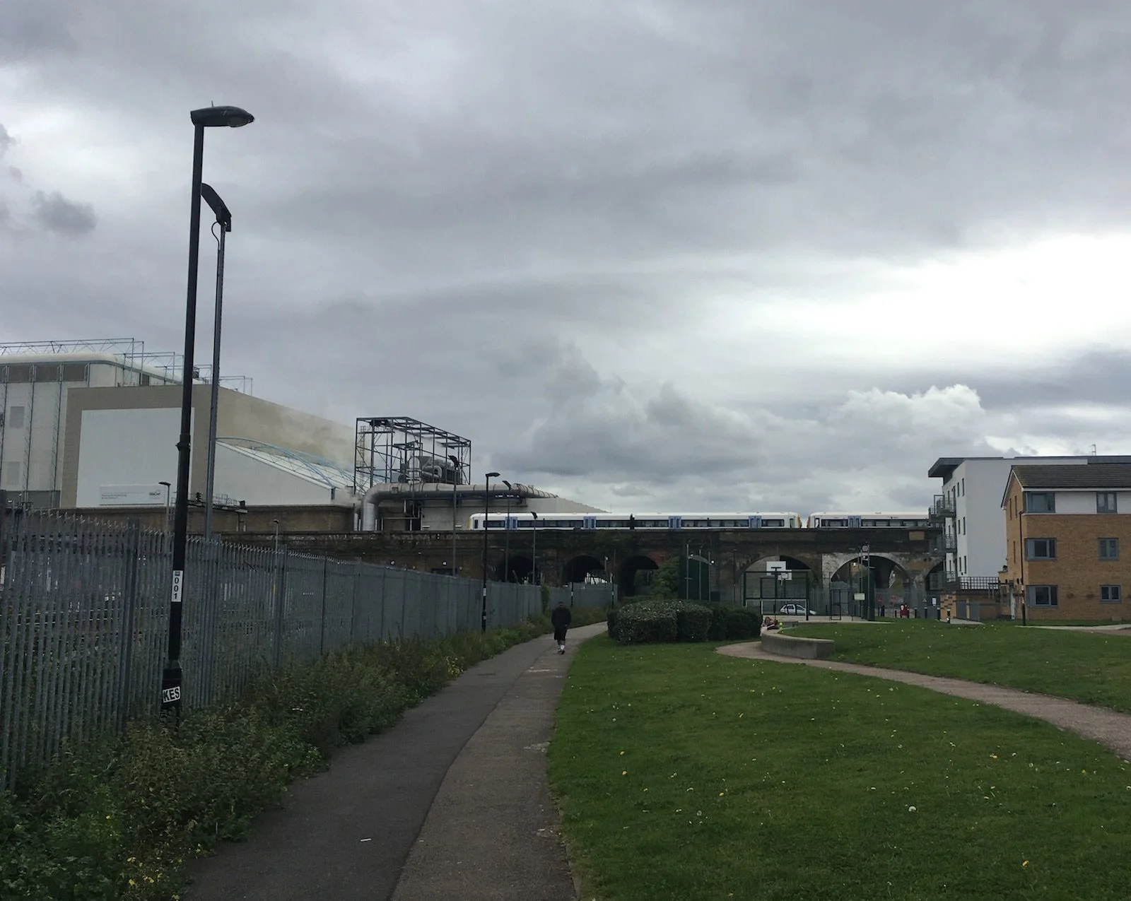 Im Prinzip ist es nicht weit, bis zum Stadion nach Millwall. Drei verschiedene U-Bahnen, zweimal umsteigen. Dann zu Fuß an den Schienen entlang. Einfache Mietskasernen, links ein unendlich wirkender grauer Metallgitterzaun. Irgendwann kommt neben dem schmalen Asphaltweg mal ein Spielplatz. Auf ihm rennen zwei Kinder im Kreis. Unter ihnen knischen kleine Kieselsteine. Am Rande sitzt an Mädchen. Kippe im Mund, Hund an der Leine. Sie blickt teilnahmslos in Richtung Süden. Dort, wo ein Müllwerk dampft. Irgendwo rattert ein Zug.