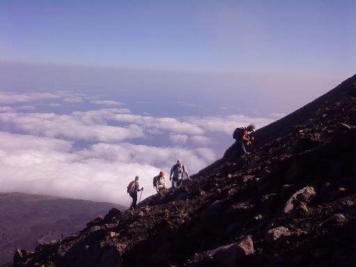 Langsam beginnt es zu dämmern. Der Weg ist gut erkennbar, der Anstieg zu Beginn auch noch nicht zu steil. Dies ändert sich allerdings, je höher wir kommen. Dann geht es nur noch im Zick-Zack-Kurs. Das Herz wummert, die Luft wird merklich dünner. Hin und wieder einmal durchschnaufen. Ein paar Leute überholen wir. Immer gut, wenn man zu Hause ein wenig Sport gemacht hat. Sich trainiert und fit fühlt. Langsam kommt die Sonne raus. Die Gesteinsbrocken am Rande werden größer. Unter uns die Wolken.